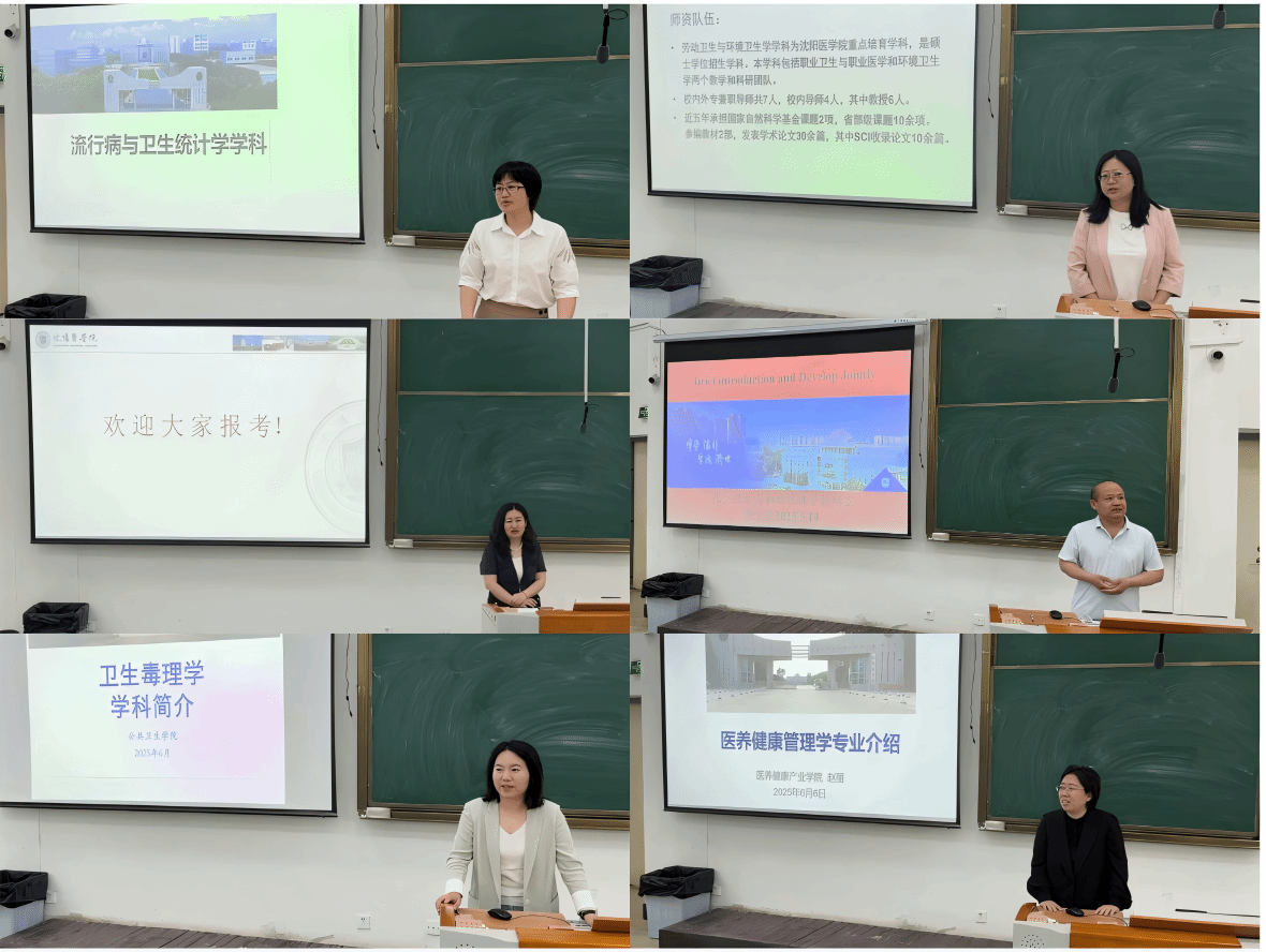 接下来,由流行病与卫生统计学、劳动卫生与环境卫生学、营养与食品卫生学、儿少健康与妇幼保健学、卫生毒理学和医养健康管理学6位学科带头人依次为学生从学科研究方向,学科科研成果,学科就业去向等同学们最为关切的内容进行详细介绍。