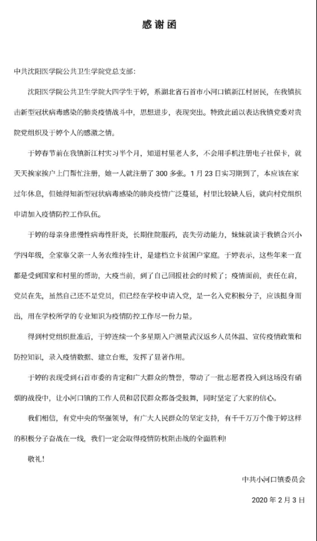 培养了品德高尚、技能高超的学生,为当地疫情防控工作做出了突出贡献。感谢函中提到:“于婷的表现受到石首市委的肯定和广大群众的赞誉,带动了一批志愿者投入到这场没有硝烟的战役中,让小河口镇的工作人员和居民群众都备受鼓舞,同时坚定了大家的信心。我们相信,有党中央的坚强领导,有广大人民群众的坚定支持,有千千万万个像于婷这样的积极分子奋战在一线,我们一定会取得疫情防枕阻击战的全面胜利!”