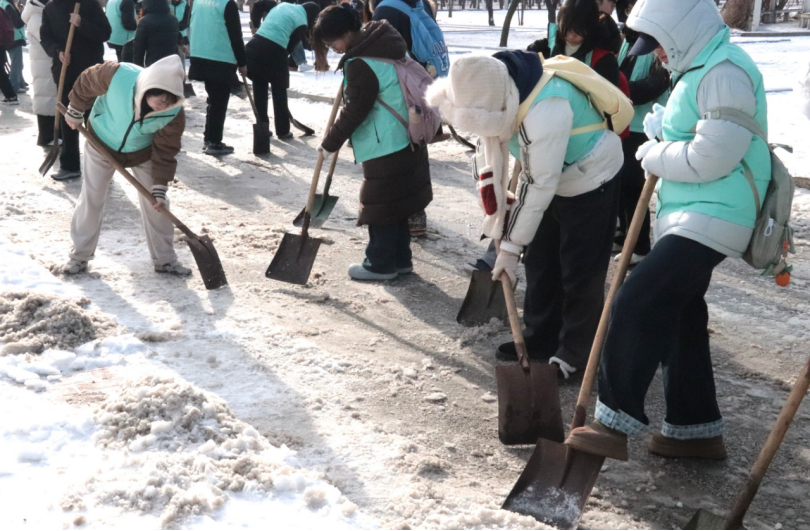 为积极响应学校铲雪除冰工作部署,切实保障师生出行安全,12月24日,草榴社区 组织24级、25级学生志愿者,在康复楼门前开展铲雪志愿服务活动。